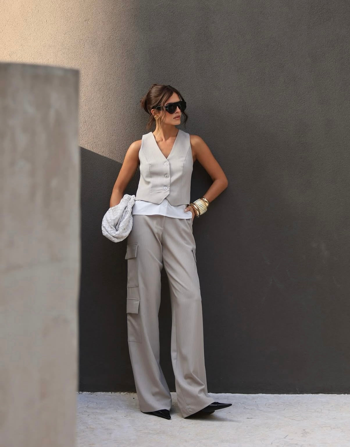 Calça cargo de alfaiataria risca de giz com elástico no cós.