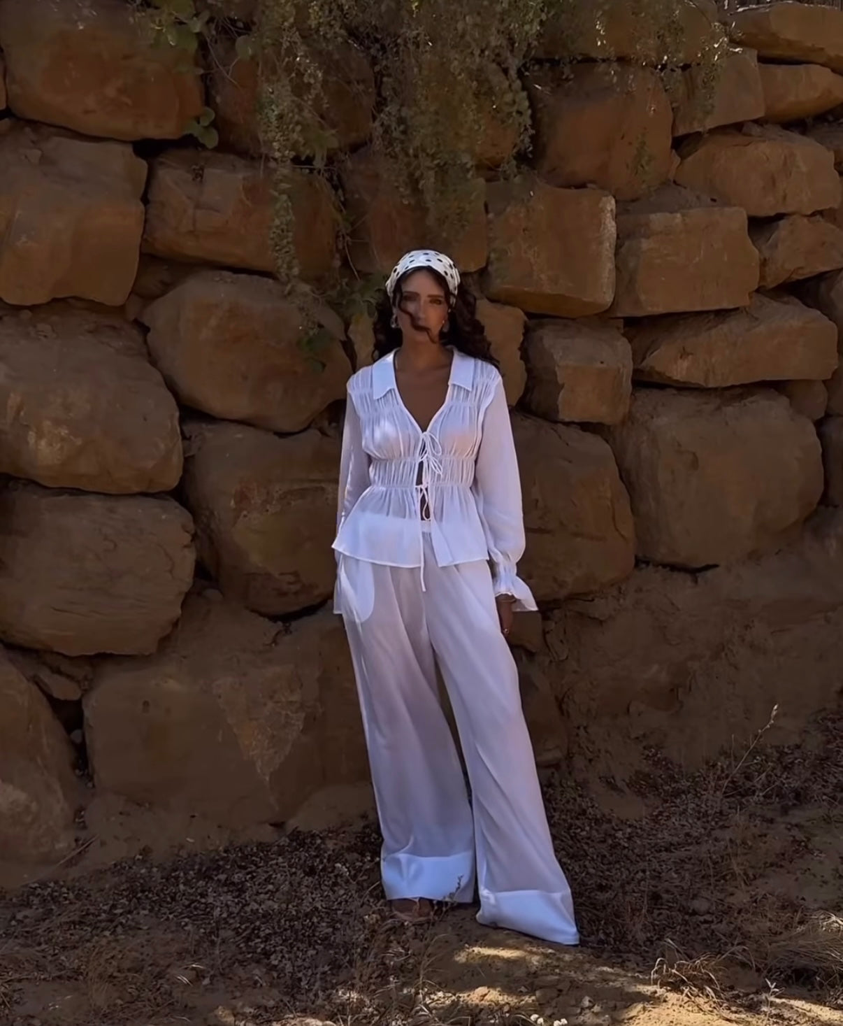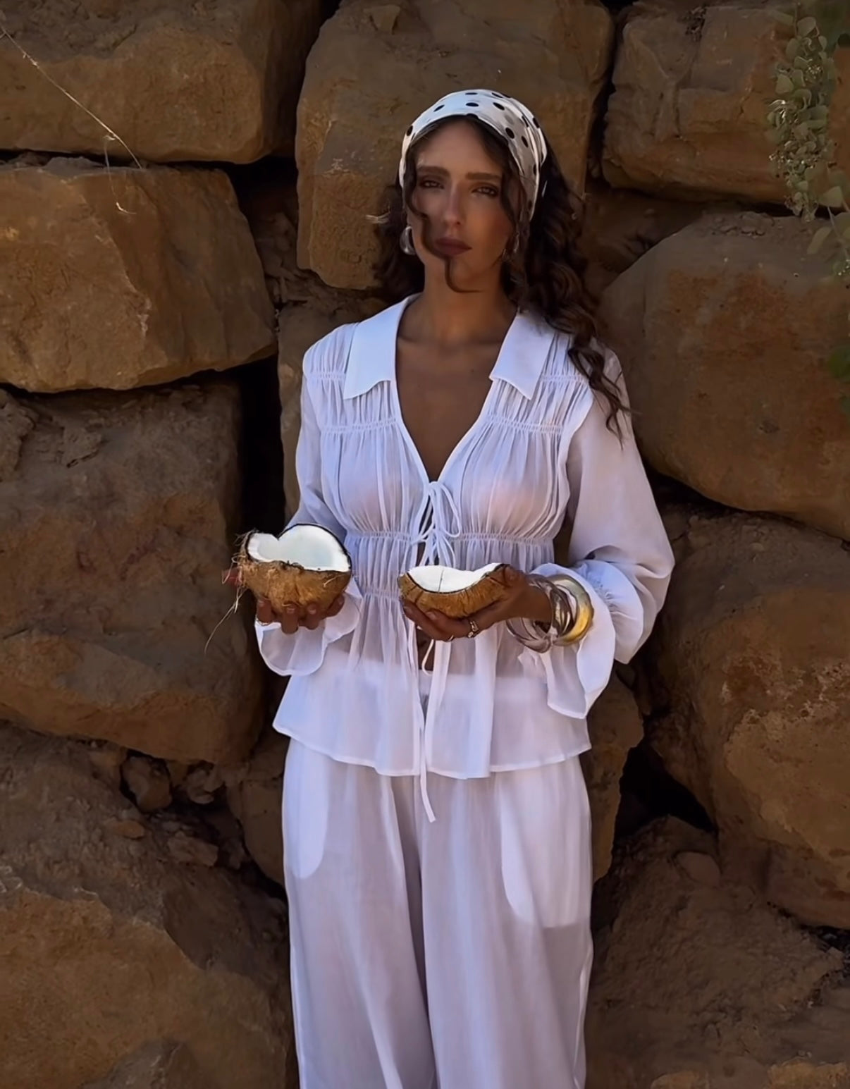 Conjunto de algodão de camisa com amarração frontal e calça com transparência e short nude removível.
